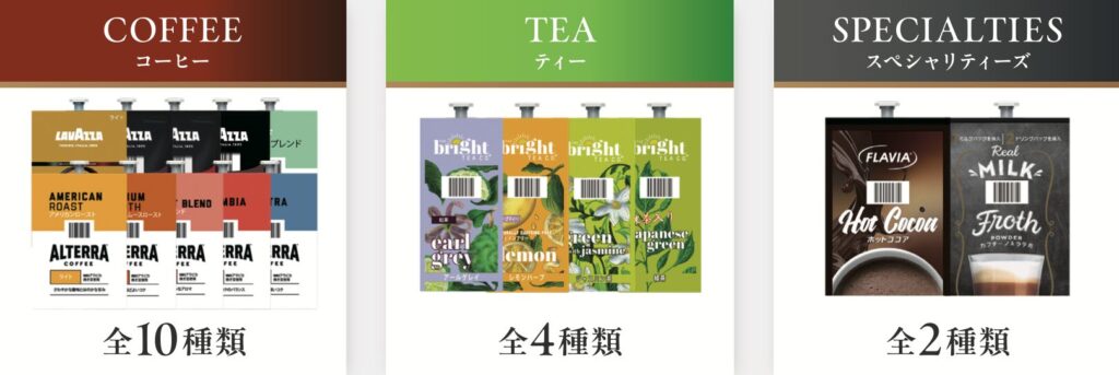 いいえ、選べます!ドリンクパックは全16種類(コーヒー、ティー、ココアなど)の豊富なラインナップの中から 、ご自身の好みに合わせて7レール分を自由に組み合わせることができます。
